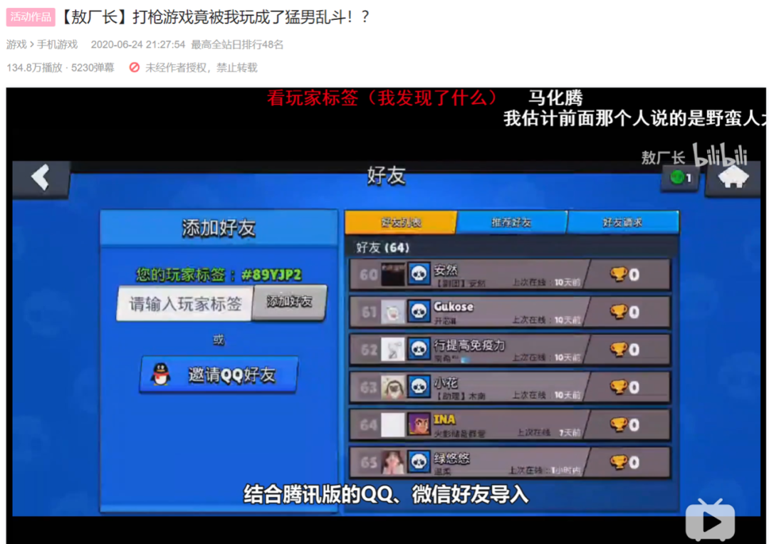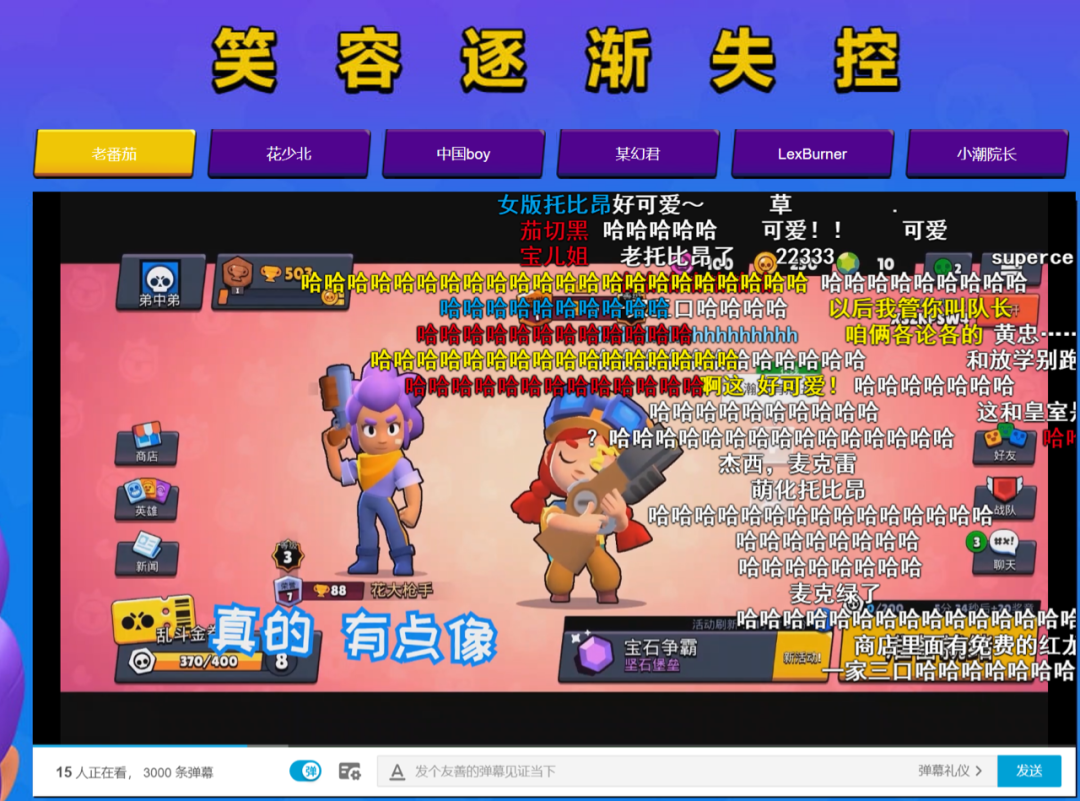 宣传效果较好的另一个原因,读娱君认为要归功于游戏本身在展示中的优势——《荒野乱斗》的玩法中除了单人吃鸡外,全部是“多人合作”类型,极其容易造就主播间互坑、沙雕的节目效果,很容易发挥主播和UP主的个人优势。如老番茄、敖厂长、王老菊等B站游戏区UP主基本都以试玩为推广内容,但效果远胜于他们接过的其他“数值类”手游。老番茄与花少北、翰哲的联排、敖厂长的“猛男”试玩、王老菊的夫妻档双排并未特意设计太多节目效果,是游戏本身的玩法画风让这些“恰饭”视频没那么刻意,弹幕也很接近他们的日常视频效果。