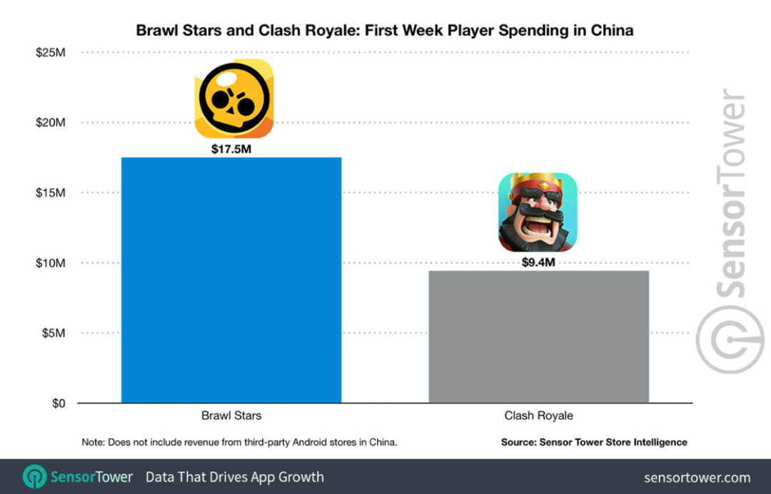 《荒野乱斗》国服于6月9日上线,据Sensor Tower数据统计,上线一周后在中国的收入已经达到了1750万美元,几乎接近当年《皇室战争》940万美元的两倍,一周内下载量达到约480万次,无疑是上半年一款现象级的手游。