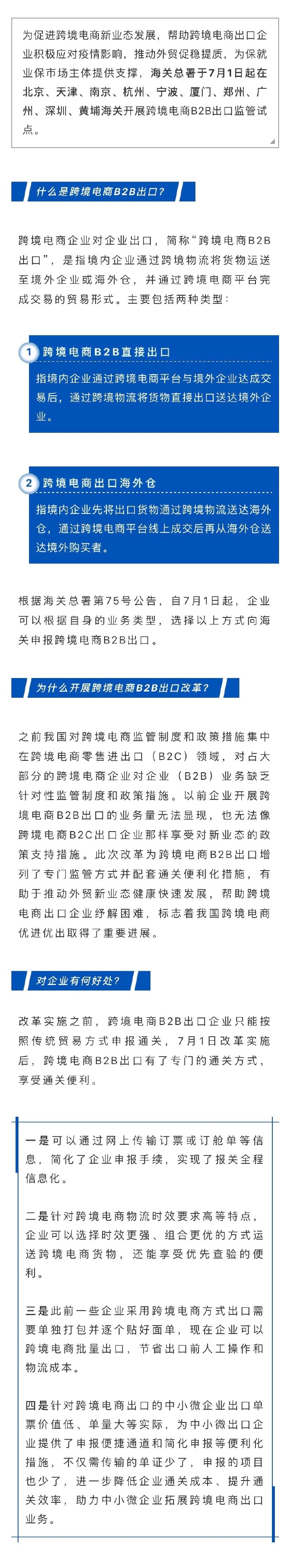 海关总署办公厅官方微博消息,为促进跨境电商新业态发展,帮助跨境电商出口企业积极应对疫情影响,推动外贸促稳提质,为保就业保市场主体提供支撑,海关总署于7月1日起在北京、天津、南京、杭州、宁波、厦门、郑州、广州、深圳、黄埔海关开展跨境电商B2B出口监管试点。