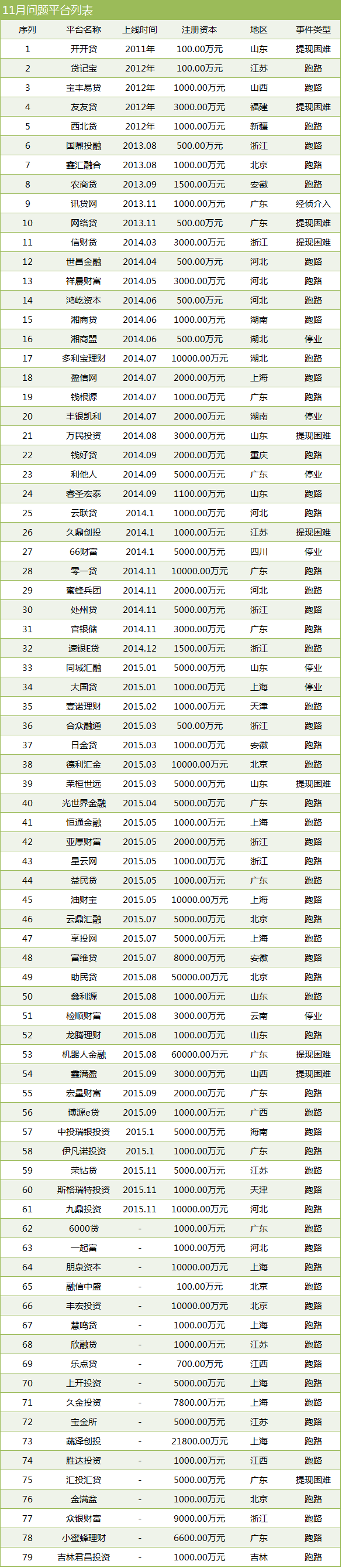 尤其值得注意的是,在这79家问题平台中,跑路平台就有61家,占去了近八成。跑路平台平均运营时间为11.95个月,由此看来多数平台是因经营不善而跑路,更大的原因在于年关将至,资金流动性趋紧。
