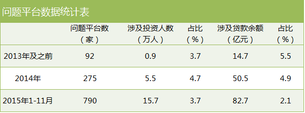 平台跑路,投资者受伤。数据显示,截至11月底,2015年问题平台涉及的投资人数约为15.7万人,涉及贷款余额为82.7亿元。