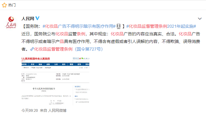 《条例》发布后,#国务院公布化妆品监管条例# 、#化妆品广告不得明示暗示有医疗作用#等话题纷纷登上热搜,阅读热度分别达到3172.7万及5281万。