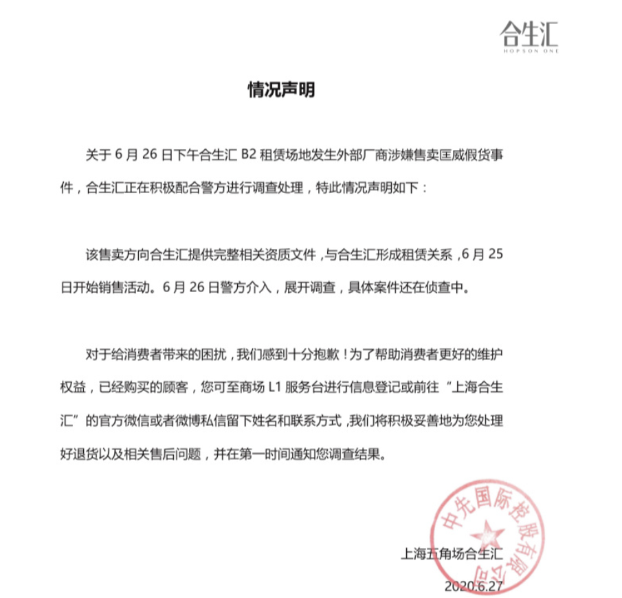 次日,上海合生汇发布声明,称此前已收到售卖方提供的完整资质文件,所以与其建立租赁关系,目前积极配合警方调查,已在此处购买货品的消费者可以联系商场退货。