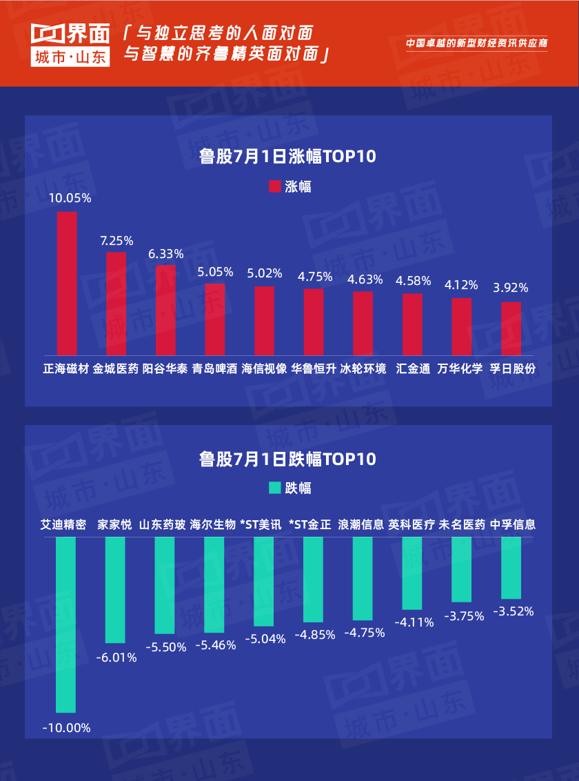 今日鲁股总结:7月1日,山东省内沪深股票有119只个股上涨,82只下跌,9只与上一个交易日收盘价持平。