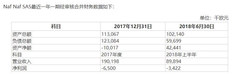 首先,拉夏贝尔决定收购时,Naf Naf SAS非但不盈利,而且已经资不抵债,处在破产边缘。2017年,Naf Naf SAS实现营业收入1.9亿欧元,亏损650万欧元。当年Naf Naf SAS的负债总额为1.23亿欧元,已经大于其总资产1.13亿欧元。被拉夏贝尔收购后, Naf Naf SAS在2018年上半年继续亏损342.2万欧元,负债总额大幅下降至5970万欧元,主要是更换股东导致的。