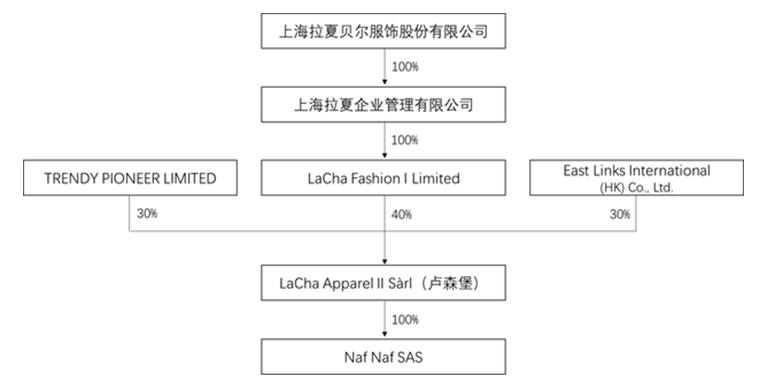 拉夏贝尔对Naf Naf SAS的收购最早开始于2018年4月。Naf Naf SAS于1973年在法国创立,主要从事女装产品及配饰销售。2018年的时候在法国、西班牙、比利时及意大利等地区共拥有494家门店。2018年拉夏贝尔联合Trendy Pioneer Limited和East Links International (HK) Co., Ltd一起收购了Naf Naf SAS,购买价格为5200万欧元,其中拉夏贝尔出资2080万欧元占40%股权。