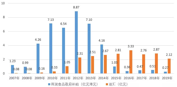 2007-2019年雨润食品与双汇发展的政府补贴规模对比