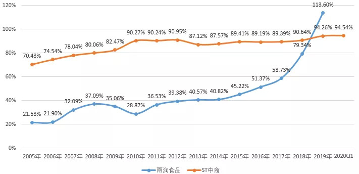 2005-2020年雨润食品和中央商场的资产负债率变动趋势(单位:%)