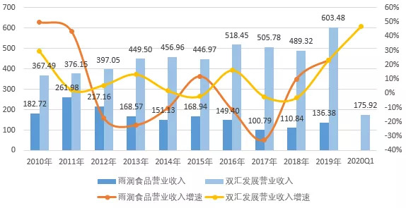 2010-2020年雨润食品和双汇发展的营业收入对比(单位:亿元,%)