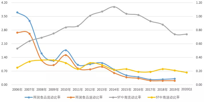2006-2020年雨润食品和中央商场的短期偿债能力水平