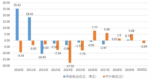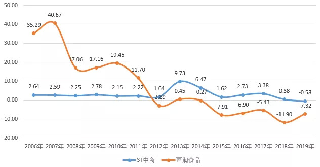 从营业收入的角度看,雨润食品营业收入2018和2019年有所回升,而中央商场2018年至今仍难见起色。