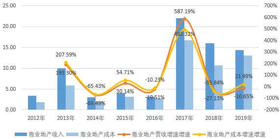 2012-2019年雨润集团房地产业务营业收入与营业成本变动(单位:亿元,%)