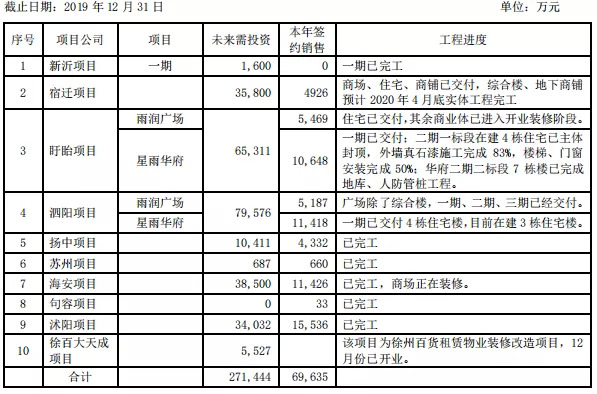 截止2019年底雨润集团个房地产项目完工进度及销售情况
