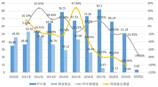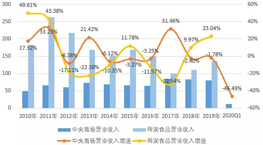 2010-2020年雨润食品和中央商场的营业收入变动(单位:亿元,%)