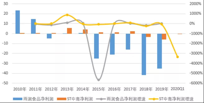 2010-2020年雨润食品和中央商场的净利润变动(单位:亿元,%)