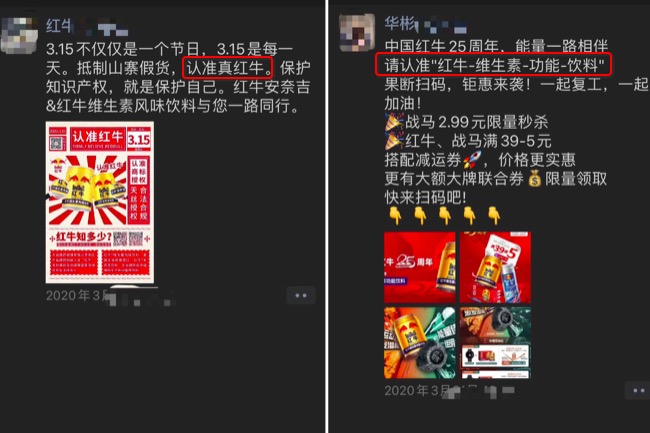 社交媒体平台上,这两家公司也都在强调自己才是“正宗”。今年3.15前后,天丝红牛以3.15为话题契机,声称抵制山寨假货,认准真红牛并保护知识产权;而华彬红牛则以“中国红牛25周年”为主题,推出了扫码抽奖活动,综合中奖率达25%,同时推出超低抢购价、满减等促销活动。