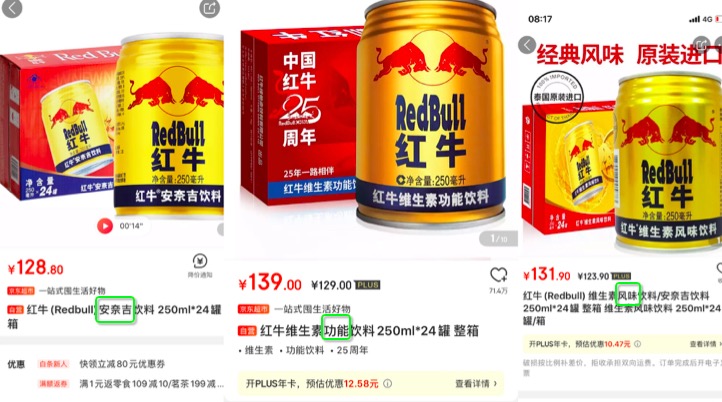 为打开销量、顺利铺货,安奈吉则采用红牛自身的“季返、月返、年返”的形式与之进行竞争。2019年12月,安奈吉又上新了泰国进口版红牛“红牛维生素风味饮料”,其产品名与华彬红牛的全称是“红牛维生素功能饮料”只有两字之差,稍不留意就会混淆。