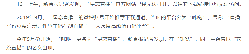 后来事情发生了反转,媒体通过溯源找到了一个叫做“星恋直播“的直播平台,并发现该平台长期存在“有剧情的色情内容直播”。与此同时据网友爆料,该平台早已多次涉及违规内容,也疑似因为违规更名了两次。
