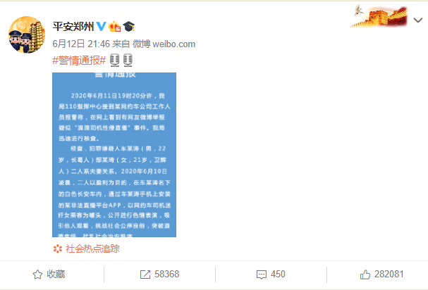 6月12日晚,@平安郑州发布警情通报。经查,视频中涉事的两人系夫妻,二人通过非法直播平台,以网约车司机迷奸女乘客为噱头色情表演,已被抓获。