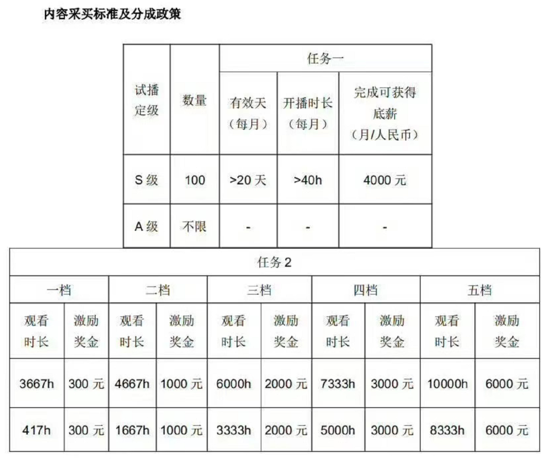 但对于主播们,这意味着“理财属性”的快速降低,“规则边界”的迅速增加。比如与栗栗的时代相比,现在的直播平台、MCN为主播们制定了复杂的考核体系,包括且不限于直播时长、粉丝观看总时长、直播有效天数,并且即便是底薪也需要通过试播来确定,低至3k高至8k。