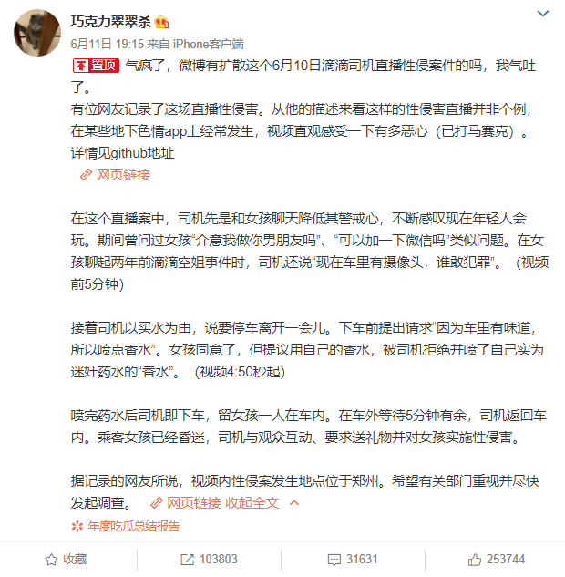 6月11日,微博网友@巧克力翠翠杀在网上发布了一条微博,声称“6月10日有滴滴司机在某直播平台上直播性侵”。随后,这条微博引发了网友的激烈讨论,并希望能尽快抓到视频中的“司机”。