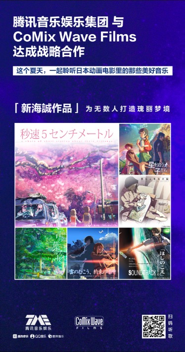 7月2日,腾讯音乐娱乐集团与拥有新海诚、角田次朗等知名作家的日本顶尖动画制作公司CoMix Wave Films Inc.(以下简称“CWF”)正式达成战略合作。通过本次合作,包括新海诚人气作品《秒速五厘米》《言叶之庭》等在内的17部动画的OST正版音源作品都将悉数上线腾讯音乐娱乐集团旗下QQ音乐、酷狗音乐、酷我音乐、全民K歌等平台。