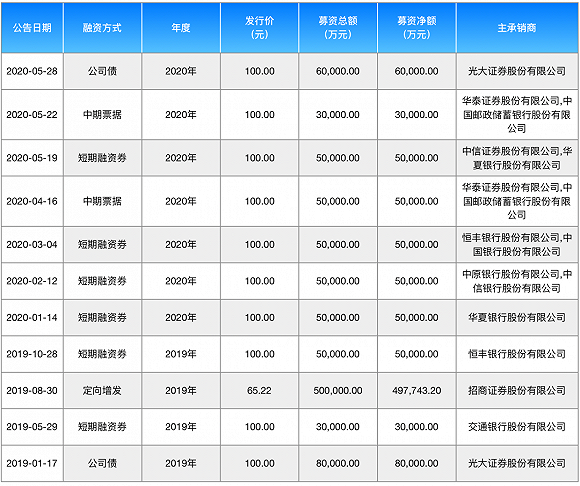 2020年3月-5月底,再发两笔共计10亿元短期融资卷,两笔中期票据共计8亿元,一笔公司债为6亿元。