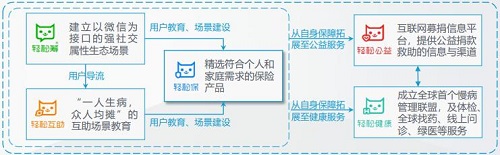 公司业务线从事前的保险防御到得病时的求助理赔,再到与公益组织的连接和健康商品的销售,甚至包括医院资源,轻松集团业务体系已经形成了大健康领域的一个相对完整的闭环。