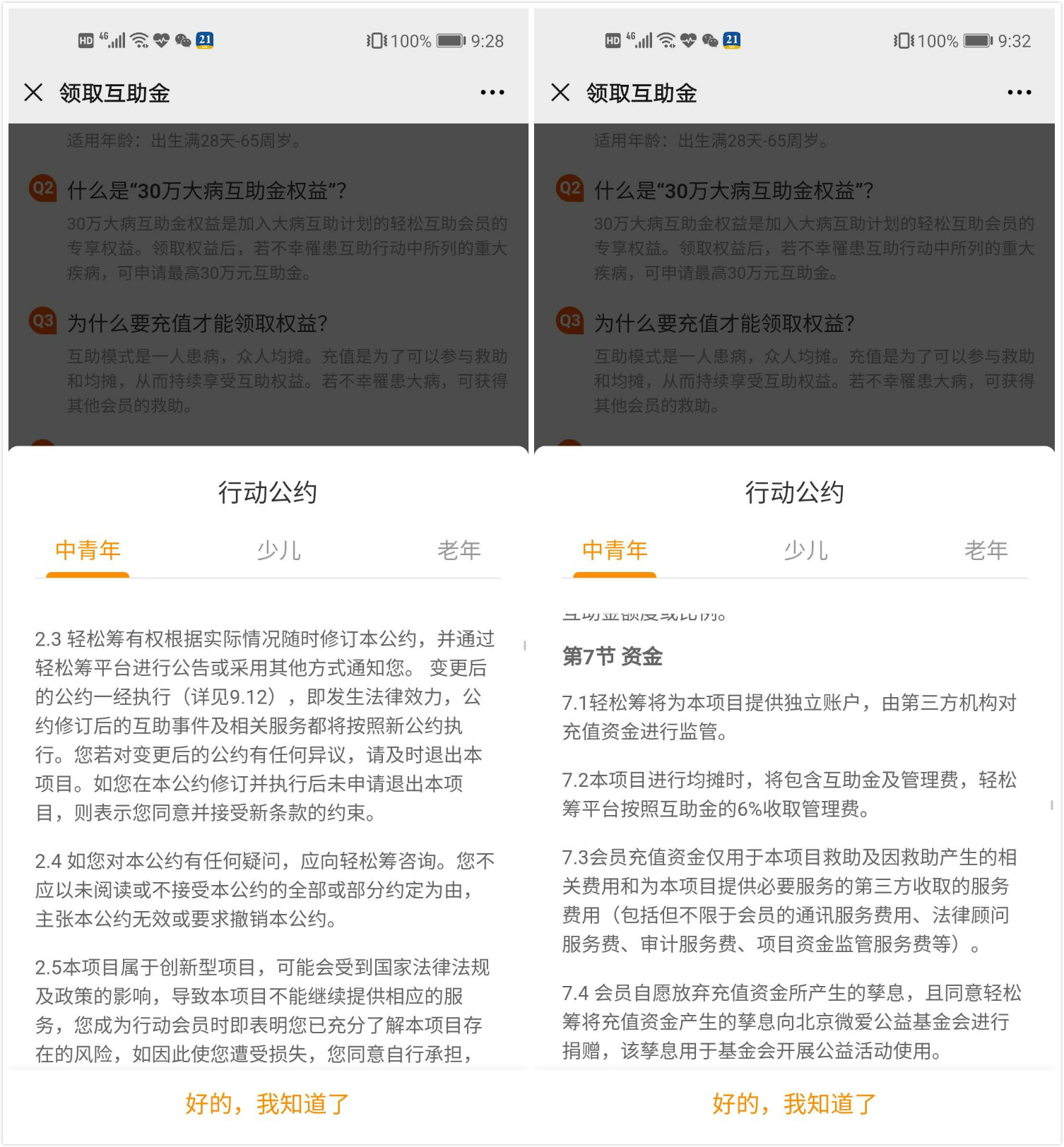 《行动公约》规定,新会员需要度过观察期(39周岁及以下180天,40周岁及以上360天),申请互助金时轻松筹平台按照互助金的6%收取管理费,会员充值资金除了用于项目救助,还包括因救助产生的服务费用,以及支付第三方服务费用(包括通讯服务费用、法律顾问服务费、审计服务费、项目资金监管服务费等)。