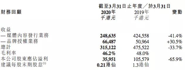 羚邦2020财年在中国大陆地区的品牌授权业务也受挫,年度收益984.9万港元,相比上一年度的1433.6万港元下滑了31%。