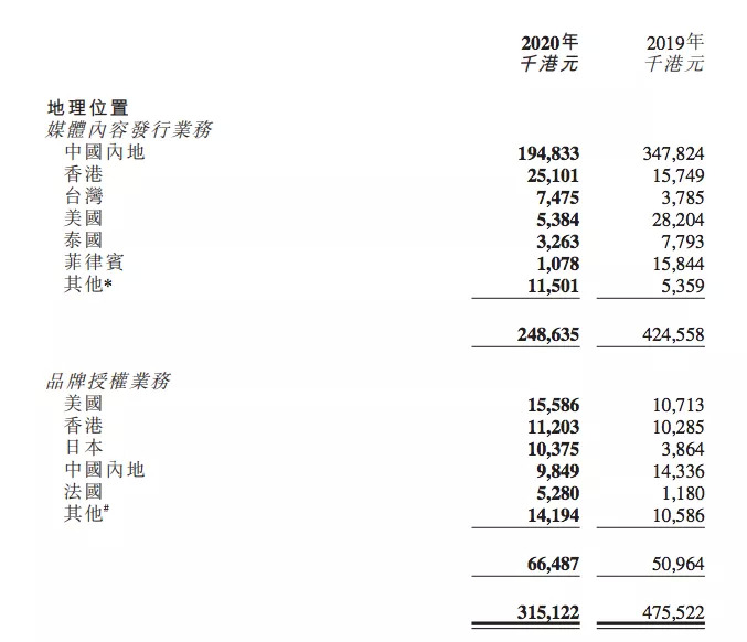 羚邦2020财年的中国大陆地区媒体内容发行收益为1.95亿港元,相比上一年度的3.49亿港元下滑了44%。中国香港、中国台湾和其他(主要包括印度尼西亚、马来西亚等地区)的发行有所增长,美国、泰国、菲律宾的发行收益都是锐减,导致整体发行收益同比下滑42%,接近腰斩。