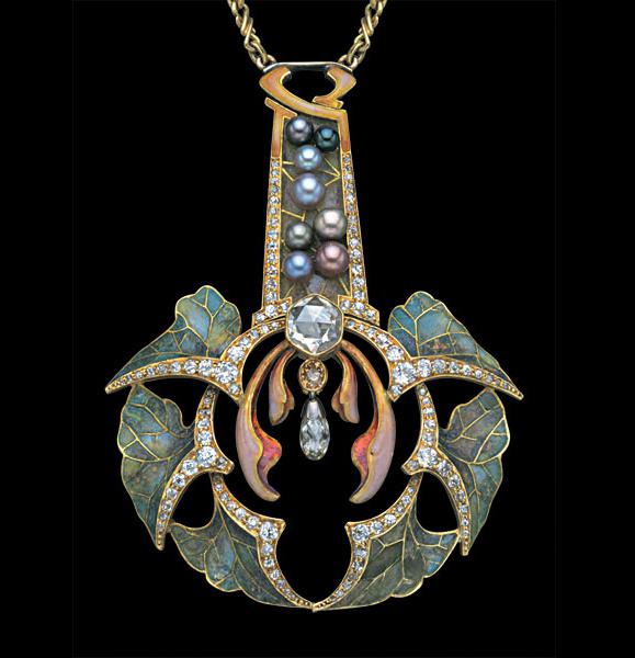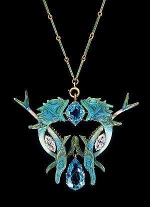 打破传统,以一种新的美学形式革新设计,是幻想美学的极致,经常以花卉和昆虫为题材,造型夸张,色彩艳丽。饰品常见的材质有珐琅、古铜、中低价宝石、以及20世纪初出现的首饰用彩色玻璃 "Art Glass"。这些材质温润的色感,加上铸造与锻造的交错运用,不仅柔化了金属先天的枯燥,如诗如画的造型也刺激了视觉感官,因此新艺术风格的珠宝又被称为“绘画的珠宝”。