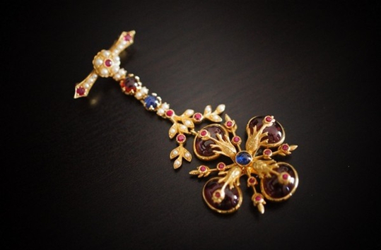爱德华七世时期风格的珍珠红蓝宝石榴石18K胸针