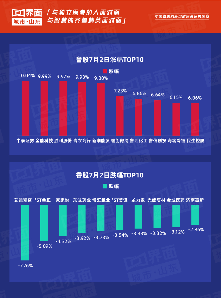 7月2日,山东省内沪深股票有154只个股上涨,52只下跌,8只与上一个交易日收盘价持平;