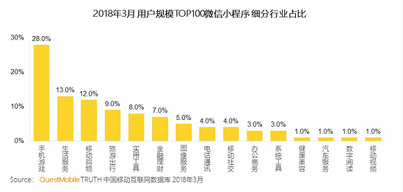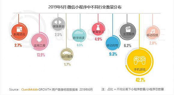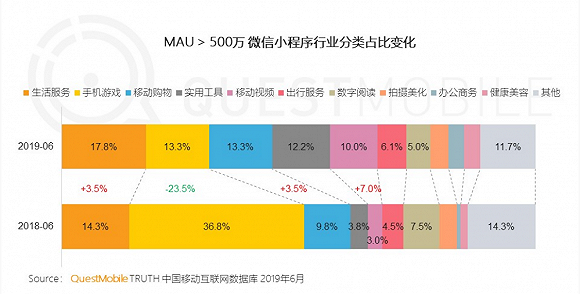 在「跳一跳」上线一年之后,从Quest Mobile的监测数据,我们可以看到,MAU>500万的微信小程序行业分类占比出现了一个有趣的变化——小游戏占比大幅下降,取而代之的是生活服务、移动视频和实用工具类等小程序应用。