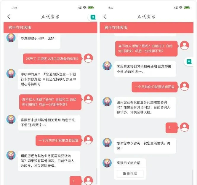 4月25日,刘伟再向客服询问工资一事时,对方表示,审核中的用户请近期注意银行卡余额变化,目前还在持续打款。但当他再次询问工资时,客服表示,没有其他业务问题询问,将关闭聊天框。“因为咨询人数较多。”