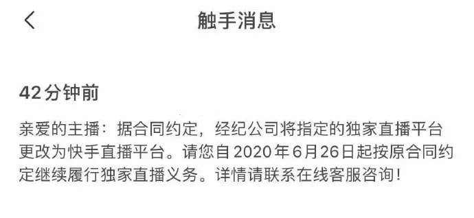 还有主播爆料,收到触手直播告主播通知书。通知书显示,据合同约定,经纪公司将指定的独家直播平台更改为快手直播公司平台。