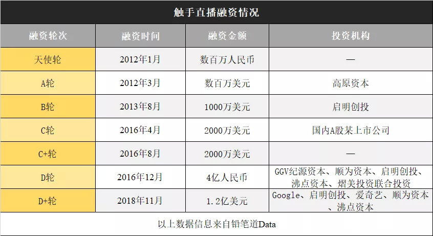 触手成立于2011年,据统计,迄今为止,触手直播平台共获得7轮,超2.3亿美元融资。投资方包括爱奇艺、启明创投、GGV纪源资本、顺为资本、谷歌等。