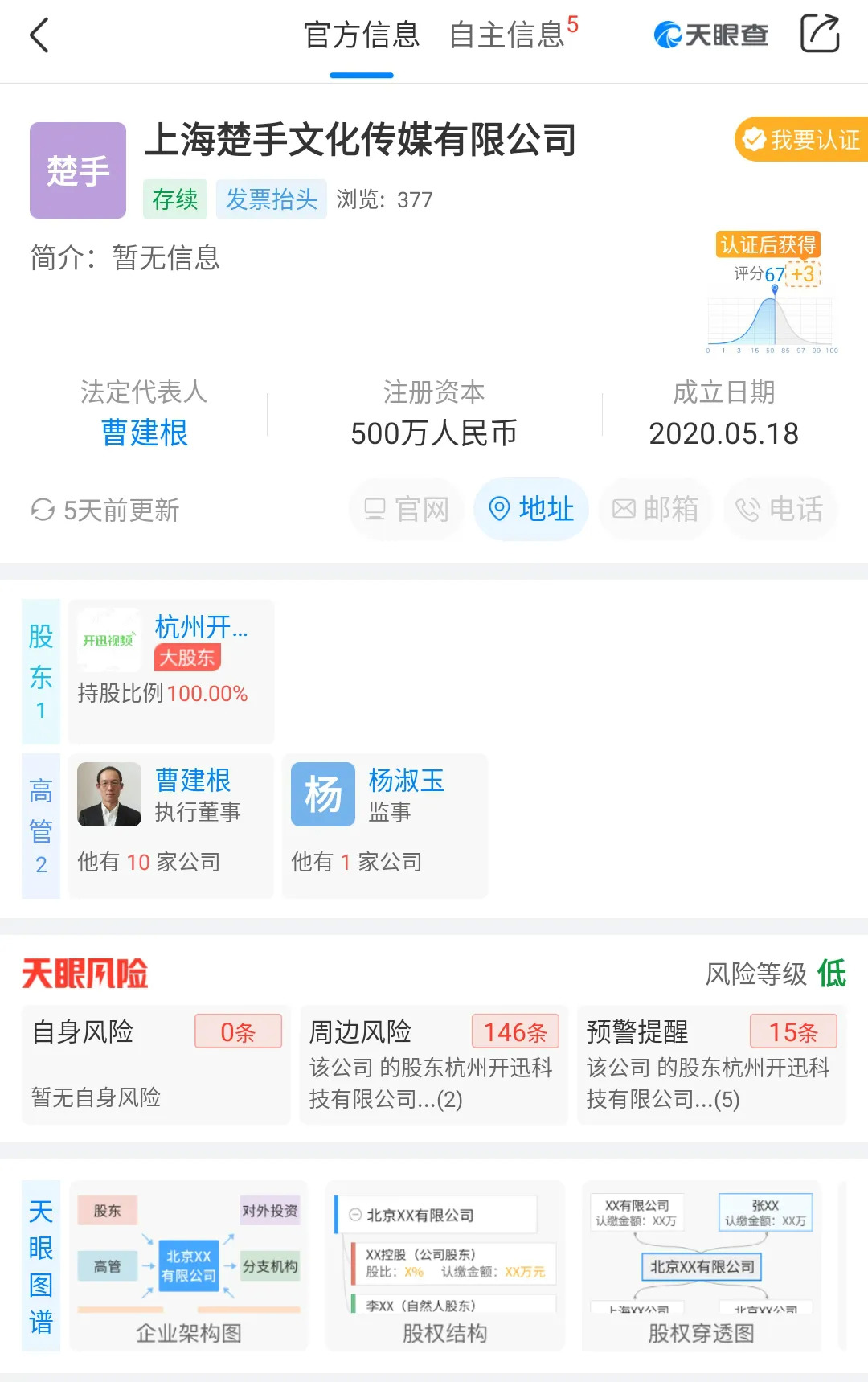 据天眼查显示,5月18日,触手直播运营主体杭州开迅科技有限公司新成立了一家名为“上海楚手文化传媒有限公司”的分公司,公司法人为触手TV创始人兼CEO曹建根,公司由杭州开迅100%控股。这样的操作似乎是在证实之前主播们的猜测。