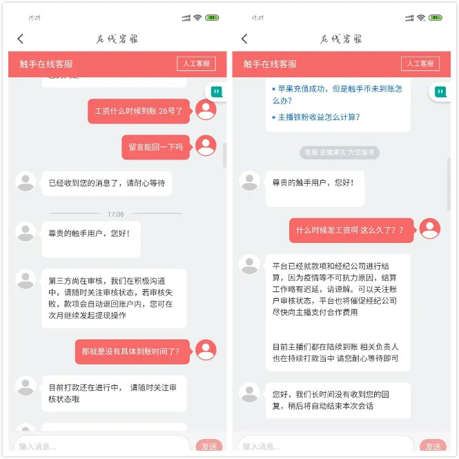 接下来,他又两次询问工资什么时候到账,但对方都表示,平台已经就款项和经纪公司进行结算,因为疫情不可抗力原因,结算工作略有延迟,并称平台也将催促经纪公司尽快向主播支付合作费用。