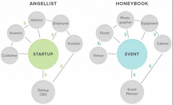 而下图是一些基于AngelList和Honeybook的例子--展示了市场网络生态系统中的多个参与者如何相互影响。