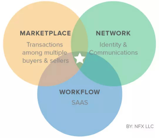 除了以上的这些传统策略之外,最近我们也看到一种趋势,就是在一个交易平台内,将买卖双方的工作流程深度产品化。这个解决方案由James Currier和NFX团队在近几年提出的,它是建立一个“市场网络”,这个网络既是SaaS工具,也是交易平台。