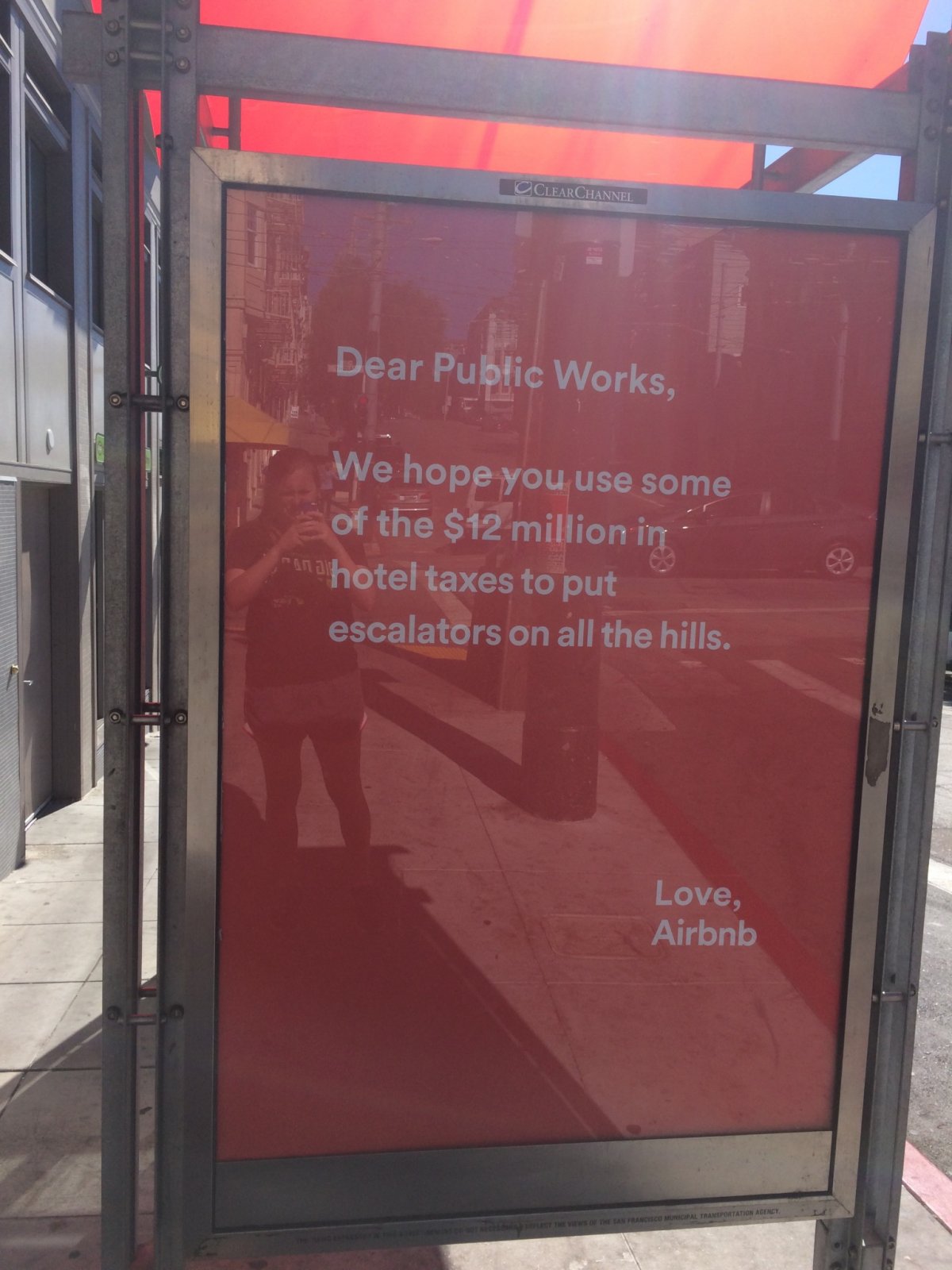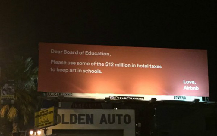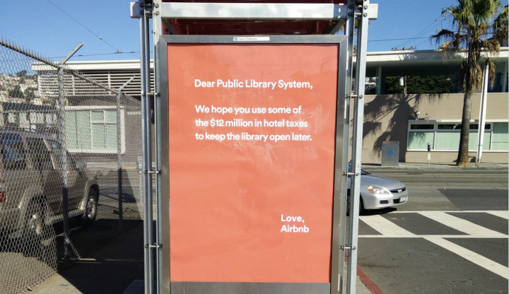 大概是因为对高昂的纳税政策不满意,Airbnb在旧金山街头的广告牌上给当地的教育、图书馆等机构写了几封“公开信”。大意是:你们每年收那么多旅店税(1200万美元),也要用来让自家的图书馆开放的时间更长一点,多建自行车道,多投资一下教育……”
