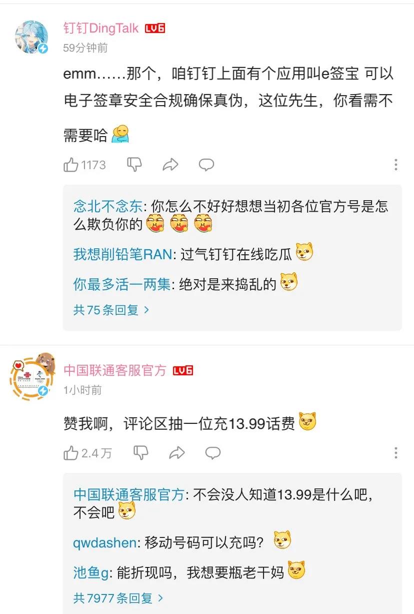 腾讯在B站发文老干妈不香了之后,评论区可谓是聚集了各路豪杰。钉钉借此宣传应用e签宝;中国联通抽奖送话费;江小白抽奖送自家套水果味装;阿里云抽奖送老干妈……群嘲之余,也都借此热度宣传自家品牌。