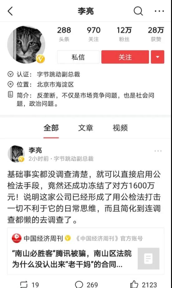 字节跳动作为腾讯的老对头,其副总直接下场炮轰。“基础事实都没有调查清楚,就可以直接启用公检法手段,竟然还成功冻结了对方1600万元!说明这家公司已经形成了用公检法打击一切不利于它的日常思维,而且简化到连调查都懒的去调查了。”