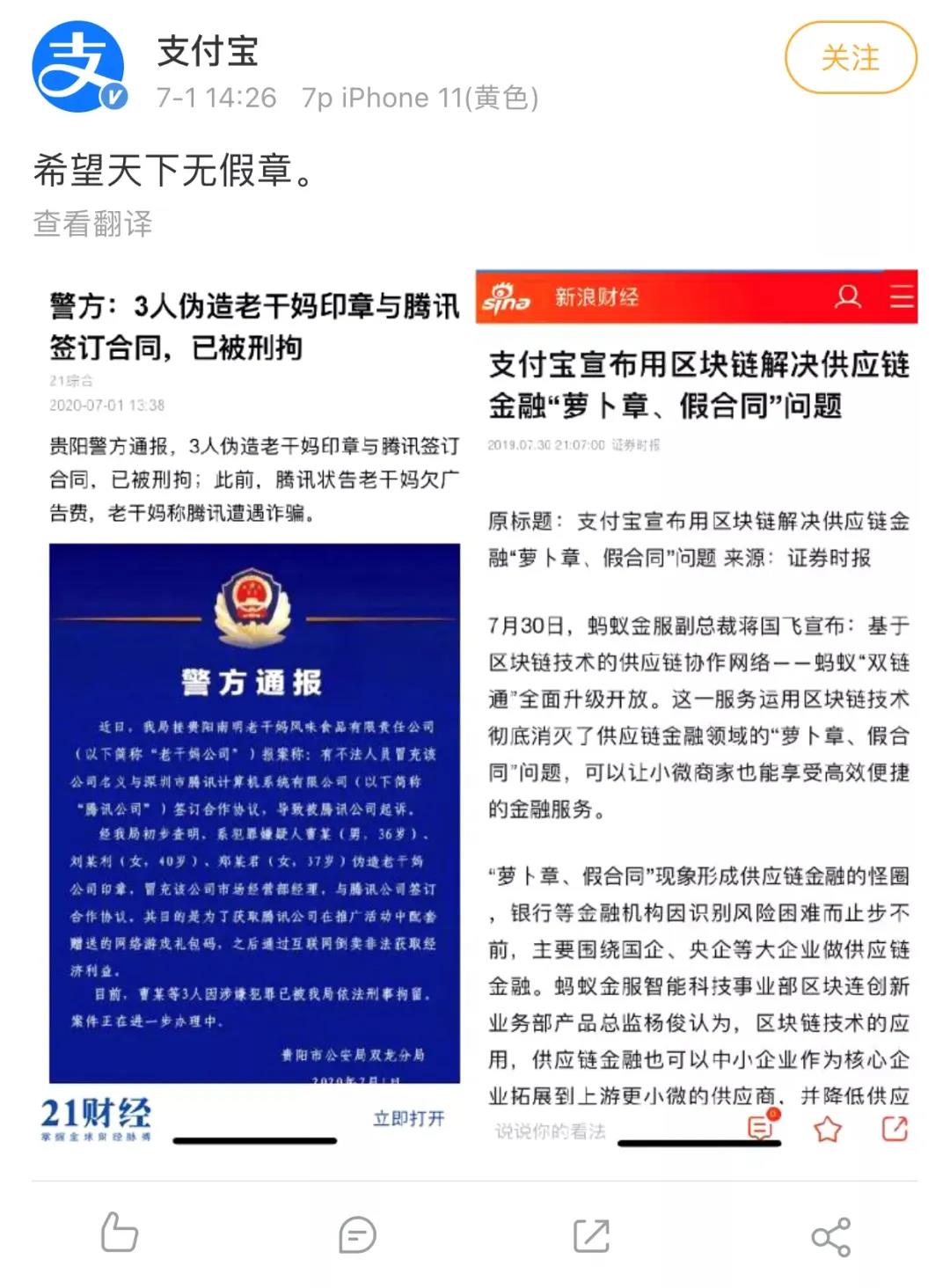 支付宝作为“凑热闹”第一人,借此机会巧妙的宣传了其区块链技术,并称其可以解决“萝卜章、假合同”问题。既向大家普及了区块链合同的安全性,还顺势暗讽了一把可怜巴巴的小企鹅。