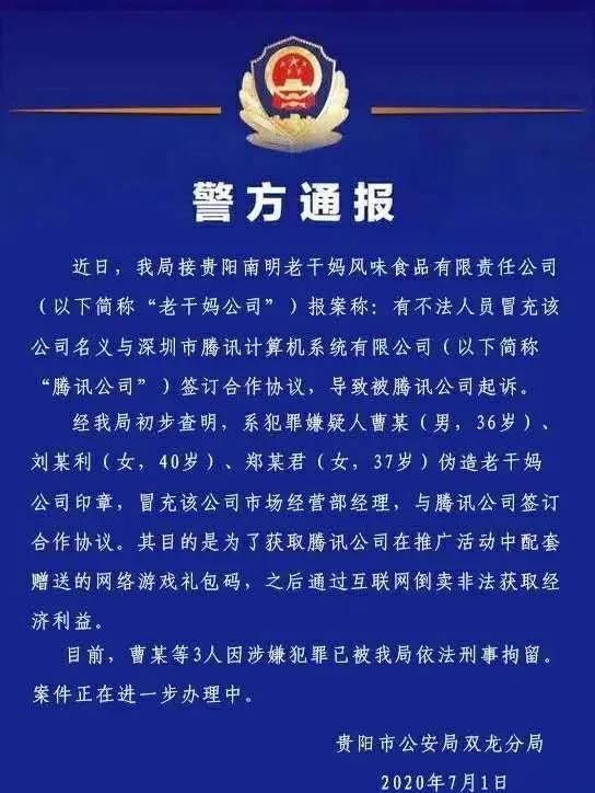 7月1日,贵阳警方发出的一则通报让广大吃瓜网友明白了真相:3人伪造了老干妈的公司印章,已被拘留。