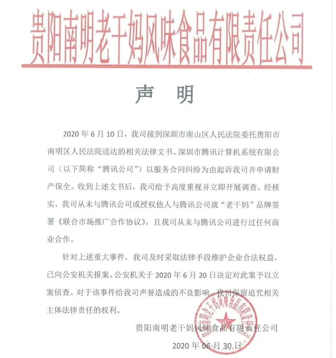 可谁能料到,6月30日晚,老干妈发布声明直接否认了与腾讯公司的商业合作关系。