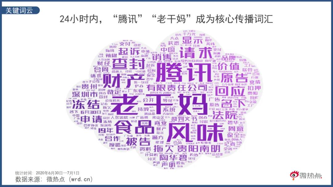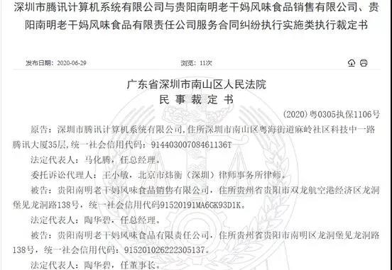 6月29日,广东省深圳市南山区人民法院发布了一则民事裁定书,同意腾讯查封、冻结被告老干妈公司名下价值人民币1624万元的财产。