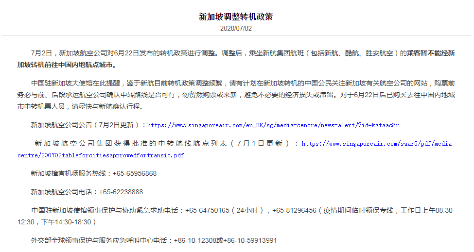 7月2日,新航对6月22日发布的转机政策进行了调整。调整后,乘坐新航集团航班(包括新航、酷航、胜安航空)的乘客,暂不能经新加坡转机前往中国内地航点城市。